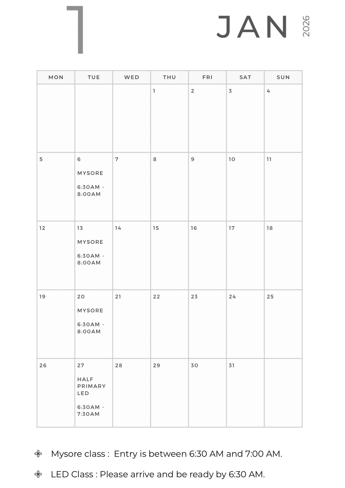 Traditional Ashtanga Yoga cannot be learned in just one or two sessions. At Kokolo Ashtanga Yoga, consistency is key. In Mysore class, your practice will evolve naturally—starting shorter and gradually extending over time. Repeating sequences enhances focus, deepens breath, and brings mental clarity and stability.